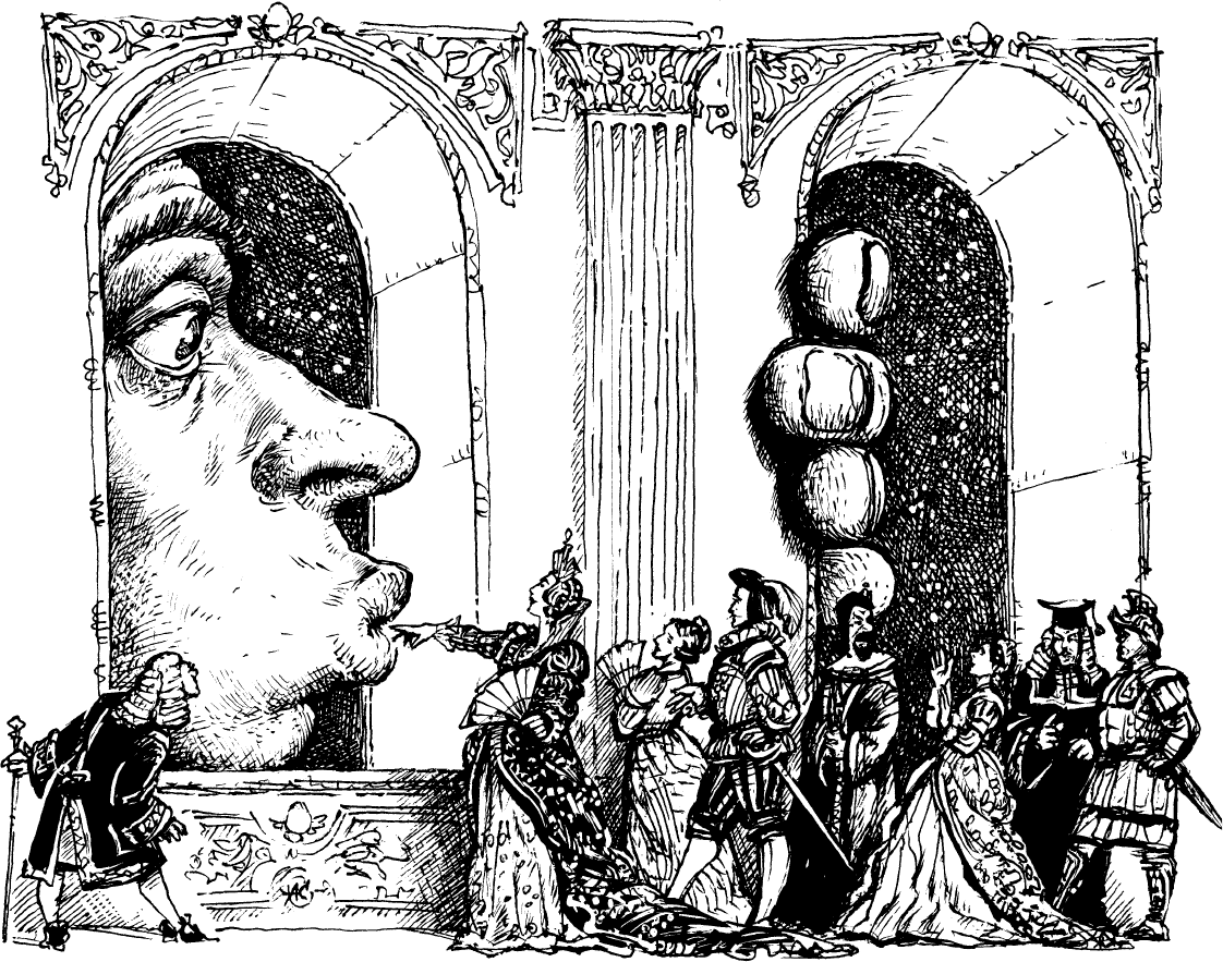 Наконец, под торжественной присягой вышеназванный Человек-Гора обязуется в точности соблюдать означенные пункты, и тогда он, Человек-Гора, будет получать ежедневно еду и питье в количестве, достаточном для прокормления 1724 наших подданных. Вместе с этим Человек-Гора будет пользоваться свободным доступом для лицезрения нашей особы и другими знаками нашего благоволения. Дано в Бельфабораке, нашем дворце, в двенадцатый день девяносто первой луны нашего царствования.