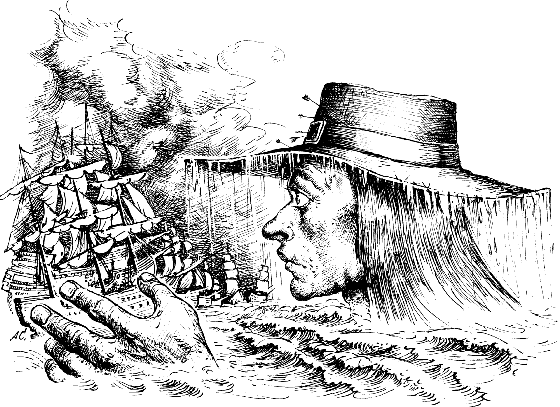 Империя Блефуску находится на острове, расположенном на северо-восток от Лилипутии и отделенном от нее проливом шириною в восемьсот ярдов. Я еще не видел острова; узнав же о предполагаемом нашествии, старался не показываться на этой стороне берега из опасения быть замеченным с кораблей неприятеля, который не имел никаких сведений о моем присутствии, так как во время войны всякое сношение между двумя империями было запрещено под страхом смертной казни и наш император наложил эмбарго на выход какого бы то ни было судна из гаваней. Я сообщил его величеству составленный мною план захвата всего неприятельского флота, который, как мы узнали от наших разведчиков, стоял на рейде, готовый сняться с якоря при первом попутном ветре. Я осведомился у самых опытных моряков относительно глубины пролива, часто ими измерявшейся, и они сообщили мне, что при самой высокой воде эта глубина в средней части пролива равняется семидесяти глюмглеффам, что составляет около шести европейских футов, во всех же остальных местах она не превышает пятидесяти глюмглеффов. Я отправился на северо-восточный берег, откуда видна империя Блефуску, спрятался за бугорком и направил свою подзорную трубку на стоявший на якоре неприятельский флот, в котором насчитал до пятидесяти боевых кораблей и большое число транспортов. Возвратившись домой, я приказал (получив на то полномочие) доставить мне канат покрепче и известное количество возможно толстых железных брусьев. Мне привезли канат толщиною в обыкновенную бечевку и брусья величиной в нашу вязальную спицу. Чтобы придать этому канату большую прочность, я сплел его втрое и с тою же целью скрутил вместе по три железных бруска, загнув их концы в виде крючков. Прикрепив пятьдесят таких крючков к такому же числу веревок, я возвратился на северо-восточный берег и, сняв с себя кафтан, башмаки и чулки, в кожаной куртке вошел в воду за полчаса до прилива. Сначала я быстро пошел вброд, а у середины проплыл около тридцати ярдов, пока снова не почувствовал под собою дно. Таким образом, меньше чем через полчаса я достиг флота. Увидя меня, неприятели пришли в такой ужас, что, как лягушки, попрыгали с кораблей и поплыли к берегу, где их собралось не менее тридцати тысяч. Тогда, вынув свои снасти и зацепив нос каждого корабля крючком, я связал все веревки в один узел. Во время этой работы неприятель осыпал меня тучей стрел, и многие из них вонзились мне в руки и лицо. Помимо ужасной боли, они сильно мешали работе. Более всего я боялся за свои глаза и, наверно, лишился бы их, если бы не придумал тотчас же средства для защиты. Среди других необходимых мне мелочей у меня сохранились очки, которые я держал в секретном кармане, не замеченном, как я уже говорил выше, императорскими сыщиками. Я надел очки и крепко привязал их. Вооружась таким образом, я смело продолжал работу, несмотря на стрелы неприятеля, которые хотя и попадали в стекла очков, но не причиняли им особого вреда. Приладив все крючки и взяв узел в руку, я начал тащить; однако ни один корабль не тронулся с места, потому что все они крепко держались на якорях. Таким образом, мне оставалось совершить самую опасную часть моего предприятия. Я выпустил веревки и, оставя крючки в кораблях, смело обрезал ножом якорные канаты, причем более двухсот стрел угодило мне в лицо и руки. После этого я сх