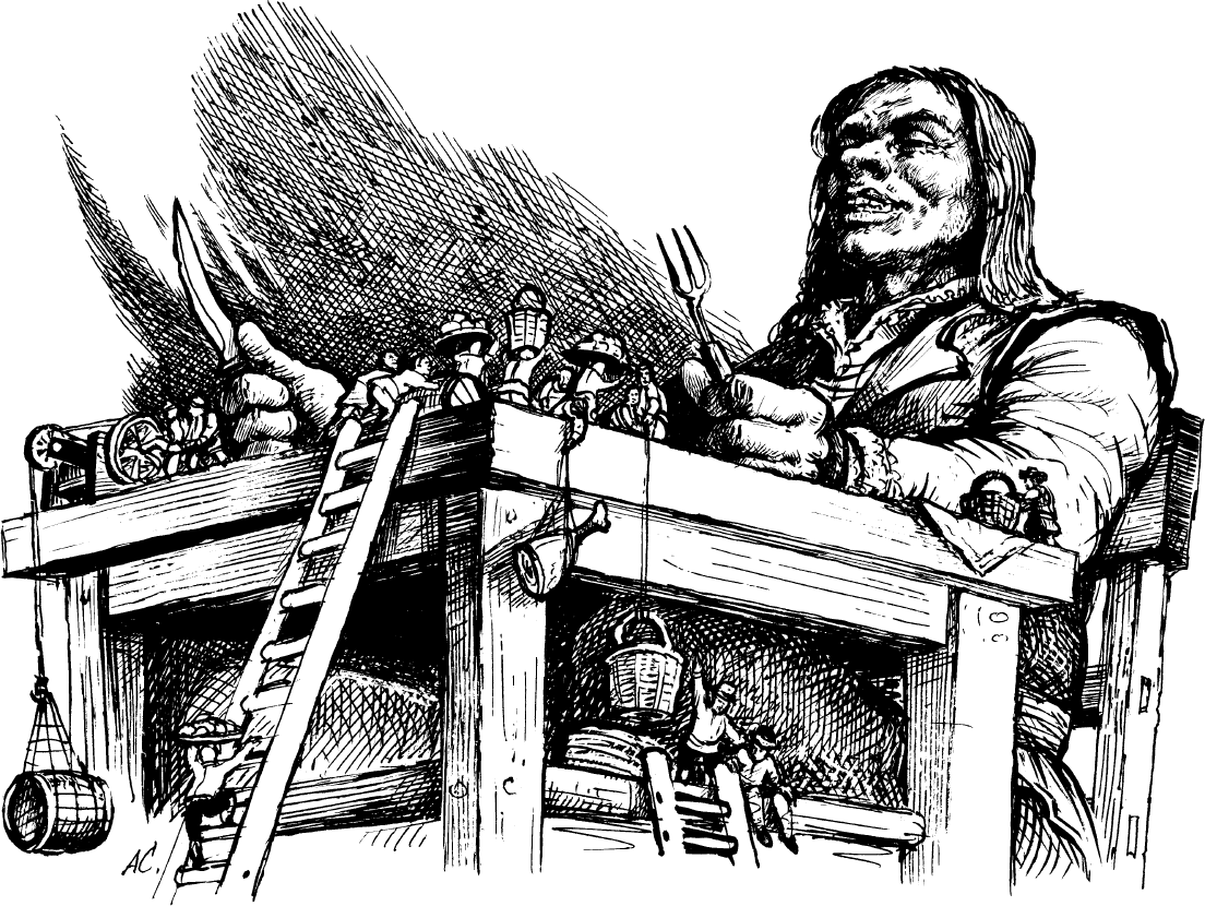 Стряпали мне триста поваров в маленьких удобных бараках, построенных вокруг моего замка, где они и жили со своими семьями; они обязаны были готовить мне по два блюда на завтрак, обед и ужин. Я брал в руку двадцать лакеев и ставил их себе на стол; сотня их товарищей прислуживала на полу; одни носили кушанья, другие подкатывали бочонки с вином и всевозможными напитками. Лакеи, стоявшие на столе, по мере надобности очень искусно поднимали все это на особых блоках, вроде того как у нас в Европе поднимают ведро воды из колодца. Каждое их блюдо я проглатывал в один прием, каждый бочонок вина осушал одним глотком. Их баранина по вкусу уступает нашей, но зато говядина превосходна. Раз мне достался такой огромный кусок филе, что пришлось разрезать его на три части, но это исключительный случай. Слуги бывали очень изумлены, видя, что я ем говядину с костями, как у нас едят ножки жаворонков. Здешних гусей и индеек я обыкновенно проглатывал в один прием, и, надо отдать справедливость, птицы эти гораздо вкуснее наших. Мелкой птицы я брал на кончик ножа по двадцати или тридцати штук зараз.