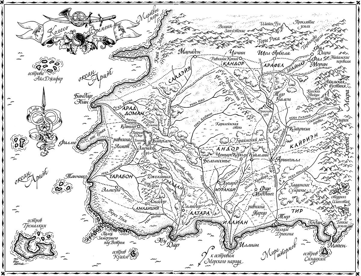 Ветер дул на северо-восток под ранним утренним солнцем над растянувшимся на бессчетные мили морем колышущейся травы с редкими купами деревьев, над быстрой рекой Луан, минуя напоминавший обломанный клык исполинский утес – Драконову гору, гору легенд, вздымавшуюся так высоко, что облака собирались, не достигнув вершины окутанного дымкой пика; Драконову гору – гору, где некогда пал Дракон, а вместе с ним, как утверждали, ушла в небытие и Эпоха легенд, и где, согласно пророчествам, он возродится вновь. Или уже возродился. Ветер дул на северо-восток, над селениями Джуалде, и Дарейн, и Алиндейр, откуда мосты, подобно каменному кружеву, перекинуты к Сияющим Стенам – величественным белым стенам Тар Валона, который многие считали величайшим городом мира, к стенам, которых каждый вечер касалась тень, отбрасываемая Драконовой горой.
