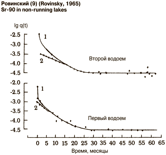 После получения формулы и теоретической кривой нужно было проверить ее применимость к естественным условиям. Ровинский не проводил для этого экспериментальных исследований, а получил откуда-то готовые цифры изменения радиоактивности в двух непроточных озерах, однократно загрязненных смесью радиоактивных изотопов, как короткоживущих, так и долгоживущих, из которых автор упоминает только Sr90. Работа Ровинского поступила в редакцию в мае 1964 г. Учитывая сроки оформления таких работ для разрешения в печать, нужно полагать, что последние измерения активности в этих озерах были сделаны не позднее осени 1963 г., то есть до того, как озеро покрылось льдом на 5–6 месяцев, что обычно для всех озер на 90 % территории СССР. Между тем измерения активности проводились 65 месяцев, то есть были начаты где-то между 1957 и 1958 гг.