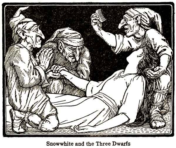 And when the men commenced carrying the coffer down the mountain they jolted it so much that the piece of poisoned apple in Snowwhite's throat fell out, and she revived and opened her eyes and looked upon the Prince who was riding by her side. Then he ordered the coffer to be opened, and told her all that had happened. And he took her home to his castle and married her.