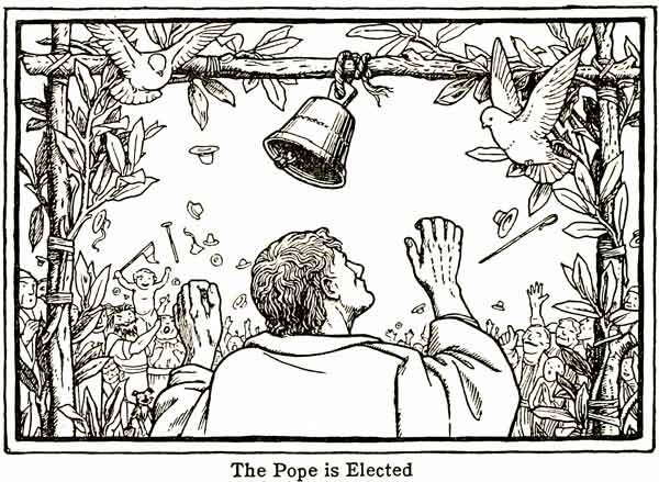 Now when they arrived at Rome they found that the Pope had just died and that they were about to select his successor. And it was decided that all the people should pass under an arch whereon was a bell and two doves, and he upon whose shoulders the doves should alight, and for whom the bell should ring as he passed under the arch was to be the next Pope. And when Jack and his companions came near the arch they all remembered his prophecy and wondered which of the three should receive the signs. And his first comrade passed under the arch and nothing happened, and then the second and nothing happened, but when Jack went through the doves descended and alighted upon his shoulder and the bell began to toll. So Jack was made Pope of all Christendom, and he took the name of Pope Sylvester.