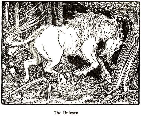 So he went with the rope and hatchet to the wood, where the unicorn had been seen. And when he came towards it he dodged it, and he dodged it, till at last he dodged behind a big tree, till the unicorn, in trying to pierce, ran his horn into the tree where it stuck fast.