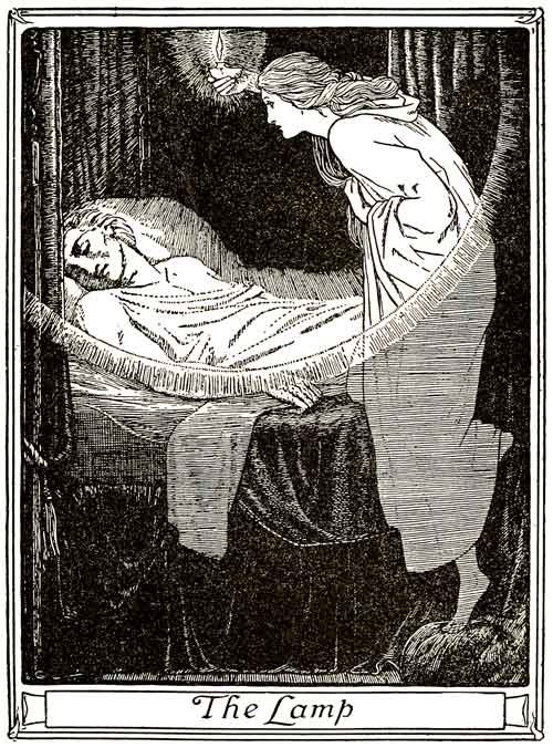 Soon after this they all departed. And the same night her husband came to Anima again, but she had already prepared a lamp of oil with a spark of fire ready to kindle it. And when she heard him sleeping by her side she lit the candle and looked at him. She was delighted to find that he was most handsome, with a strong and well-made body. But as she was looking at him her hand trembled with delight and three drops of oil fell upon his cheek from the lamp she was holding. Then he woke up and saw her, and knew that she had broken her promise, and said: