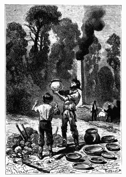 Die ersten Artikel der Colonisten bestanden nun freilich blos in gewöhnlicher Töpferwaare, welche indeß zum Kochen der Speisen vollkommen ausreichte. Das Material dazu entnahm man dem Thonboden, und ließ Cyrus Smith demselben noch etwas Kalk und Quarzkörner beimengen. Der teigige Thon stellte eine wirkliche »Pfeifenerde« dar, aus der man Töpfe, über geeigneten Steinen geformte Tassen, Teller, größere Krüge, Wasserbehälter u.s.w. erzeugte. Die Form dieser Gegenstände ließ freilich zu wünschen übrig, nachdem sie jedoch bei hohen Hitzegraden gebrannt waren, zählte die Küche der Kamine eine Reihe Geräthschaften, die unter den gegebenen Verhältnissen ebenso kostbar waren, als hätte man zu ihrer Herstellung die feinste Porzellanerde verwendet.
