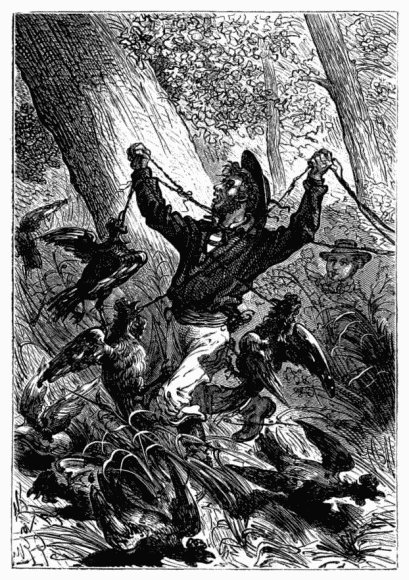 Das Zucken erweckte bald die Aufmerksamkeit der Vögel, die nun an der Lockspeise anbissen. Drei Tetras stürzten sich gierig auf die Angeln. Da zog Pencroff seine Leinen an, und sofort verieth das Flattern mit den Flügeln, daß die Vögel gefangen waren.