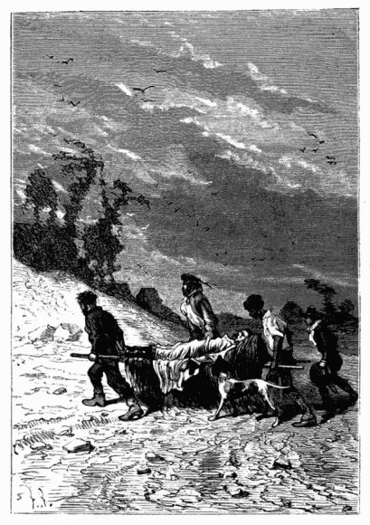 Man brachte sie herbei. Die querliegenden Aeste waren mit Moos und langem Grase bedeckt. Cyrus Smith wurde darauf ausgestreckt, Pencroff faßte sie an dem einen, Nab an dem andern Ende an, und vorwärts ging es nach der Küste.