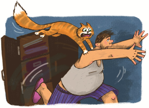 Мальчик хотел было уже рассказать папе, что Кешка в процессе перевоплощения из обычного кота в верного помощника и как раз сейчас проходит дрессировка… Но Федька не успел даже открыть рот, как Кешка заорал не своим голосом и прыгнул со шкафа… прямо на папину голову.
