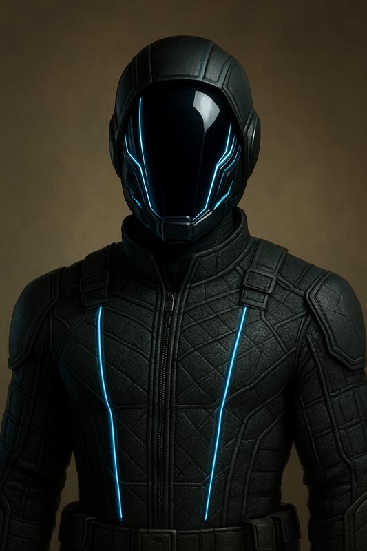 Человек. Чёрная маска на всё лицо, как чёрная дыра. В ней не видно ничего, просто темнота. Неоновые полоски голубого цвета на макушке и по бокам, и шея – немного смягчают саму атмосферу темноты и угнетения, как будто из другой реальности.