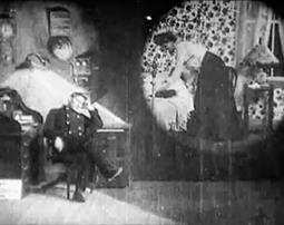 Наконец, картина «Злоключения Мэри Джейн» Смита (1903 г.) – классика черной комедии, которая отличается сложным монтажом – как внутриэпизодным, так и межэпизодным. Сначала мы видим героиню фильма, домохозяйку Мэри Джейн (Лаура Бэйли из «Позволь мне снова помечтать») на общем плане в кухне – она чистит ботинки (средний план лица Мэри Джейн, измазанного ваксой), пытается раздуть огонь в очаге (общий план) и решает использовать керосин (опять средний план, хорошо видна надпись «КЕРОСИН» на бутылке), но происходит взрыв (общий план). Следующая сцена – мы видим общий план крыши дома, Мэри Джейн вылетает в трубу, чуть погодя сверху валятся ее останки. Следующая сцена открывается крупным планом кладбищенского памятника, на котором значится: «Здесь лежит Мэри Джейн, которая разжигала очаг керосином. Мир твоим кусочкам». Общий план, к могиле подходят четыре скорбящие женщины – и в ужасе разбегаются, когда из могилы поднимается дух Мэри Джейн (двойная экспозиция) в поисках бутыли из-под керосина.