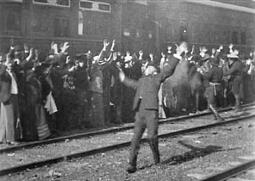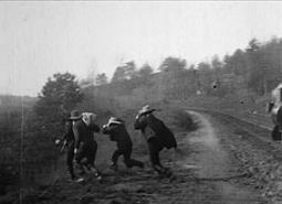 Несколько следующих сцен сняты целиком на натуре. Сначала поезд останавливается, и бандиты заставляют машиниста отцепить паровоз. Затем бандиты грабят пассажиров, выстроенных вдоль остановленного поезда. Один из пассажиров пытается совершить немотивированный побег, бандиты стреляют в него, и он, страшно переигрывая, валится на железнодорожную насыпь, окончательно восстанавливая зрителей фильма против грабителей (Рисунок 19).