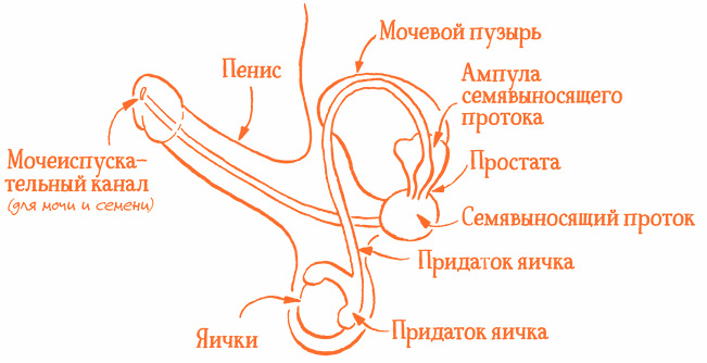 Несколько внутренних каналов и органов соединяют яички с пенисом. Сверху на каждом яичке есть орган, который называется придаток яичка, или эпидидимис. Сперма выходит из яичек, которые ее производят, в придатки, где она созревает, иначе говоря, растет. Когда сперматозоиды созревают, они уходят в следующий канал (семявыносящий проток) и попадают в своего рода бак-накопитель – ампулу семявыносящего протока, где и остаются. К счастью, у семявыносящих протоков есть мускулы, которые помогают перекачивать сперму. На этой стадии развития сперматозоиды еще не так энергично плавают и не могут сами пробраться из придатков в ампулу.