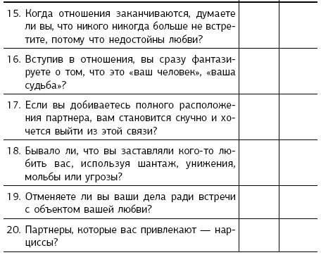 Тест: Насколько я эмоционально зависимРаз вы приобрели эту книгу, значит, тема вам откликается, а значит, вы видите в себе тенденцию к зависимости. Я предлагаю пройти тест, чтобы понять, насколько глубока ваша зависимость. Вопросы теста также хорошо помогают отследить и оцифровать свое поведение, которое порой является абсолютно автоматическим и неосознанным.