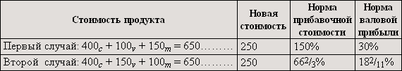 Прежде всего прибавочная стоимость понизилась на одну треть своей прежней величины, со 150 до 100. Норма прибыли понизилась несколько более, чем на одну треть, с 30 % до 18 %, так как уменьшенная прибавочная стоимость исчисляется теперь на возросший авансированный совокупный капитал. Но и она упала далеко не в том отношении, как норма прибавочной стоимости. Эта последняя со 150/100упала до 100/150, то есть со 150 % до 662/3%, в то время как норма прибыли понизилась лишь со 150/500до 100/550, или с 30 % до 182/11%. Таким образом, норма прибыли падает относительно больше, чем масса прибавочной стоимости, но меньше, чем норма прибавочной стоимости. Далее, мы видим, что стоимости, как и массы продуктов, остаются неизменными, раз применяется то же самое количество труда, хотя авансированный капитал вследствие увеличения его переменной составной части увеличился. Это возрастание авансированного капитала отозвалось бы, конечно, очень чувствительно на капиталисте, начинающем новое предприятие. Но с точки зрения воспроизводства в целом возрастание переменного капитала означает лишь одно, – что бо́льшая часть стоимости, вновь созданной при помощи вновь присоединённого труда, превращается в заработную плату и, стало быть, прежде всего в переменный капитал, вместо того чтобы превращаться в прибавочную стоимость и прибавочный продукт. Следовательно, стоимость продукта остаётся неизменной, так как она ограничена, с одной стороны, постоянной капитальной стоимостью = 400, с другой стороны – цифрой 250, которой представлен вновь присоединённый труд. Но обе эти величины остались неизменными. Новый продукт, поскольку он сам снова входит в постоянный капитал, представляет в данной величине стоимости ту же, что и прежде, массу потребительной стоимости; следовательно, та же самая масса элементов постоянного капитала сохраняет ту же самую стоимость. Иначе обстояло бы дело в том случае, если бы заработная плата повысилась не потому, что рабочему стали давать бо́льшую долю стоимости продукта его собственного труда, но если бы он стал получать бо́льшую долю стоимости продукта своего собственного труда потому, что упала производительность труда. Тогда вся стоимость, в которой выражается то же самое количество труда – оплаченного и неоплаченного – осталась бы неизменной; но масса продукта, в которой представлено это количество труда, уменьшилась бы и, следовательно, возросла бы цена каждой соответственной части продукта, так как каждая такая часть представляет теперь большее количество труда. Повышенная заработная плата в 150 единиц представляла бы не больше продукта, чем прежняя заработная плата в 100; пониженная прибавочная стоимость в 100 единиц представляла бы лишь 2/3 того продукта, 662/3% той массы потребительных стоимостей, которая прежде выражалась в 100. В этом случае вздорожал бы и постоянный капитал, поскольку в него входит этот продукт. Но это не было бы следствием повышения заработной платы, – а, наоборот, повышение заработной платы было бы следствием вздорожания товаров и следствием пониженной производительности того же самого количества труда. Здесь возникает иллюзия, будто повышение заработной платы удорожило продукт; в действительности повышение это является не причиной, а результатом изменения стоимости товаров вследствие понижения производительности труда.