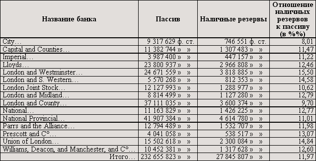 {Насколько широкое развитие получила с тех пор эта практика, доказывают следующие заимствованные из «Daily News» 123 от 15 декабря 1892 г. официальные данные относительно резервов в пятнадцати крупнейших лондонских банках в ноябре 1892 года.