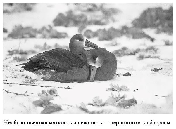 Немного отстав от остальных, я сажусь на край припудренной коралловым песком взлетно-посадочной полосы – теперь я на уровне глаз альбатроса – и вижу удивительную картину, столь близкую нам – людям. Эта пара давно сидит рядышком: они нежно пощипывают друг другу оперение на голове, с необыкновенной мягкостью по очереди чистят спинку компаньону, и вид у них при этом такой, будто нет в мире большего блаженства. Вот одна из птиц пробегает клювом по мелким перышкам, растущим у второй под глазами. А та, которой адресованы эти нежности, отводит голову в сторону, подставляя щечку, шейку. Наблюдая, как трогательно, прикрыв глаза от наслаждения, они ухаживают друг за другом, вы чувствуете, что им это доставляет громадное удовольствие, понятное любому из нас – каждому, кто хотя бы раз в жизни ощутил ласковое прикосновение.