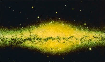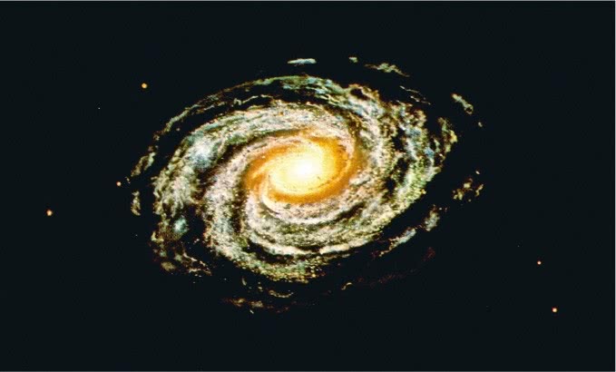 Млечный Путь, видимый из точки, немного приподнятой над плоскостью его спиральных рукавов (их голубой цвет объясняется наличием горячих молодых звезд). Вдали видно ядро галактики, состоящее из более старых красноватых звезд.