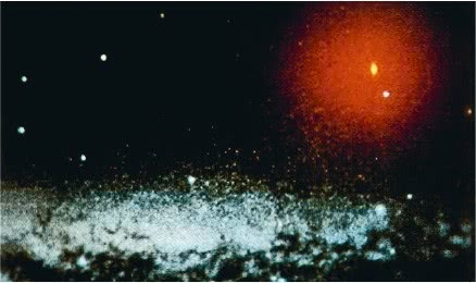 Красный гигант (на переднем плане) и видимый с ребра спиральный рукав галактики (вдали).