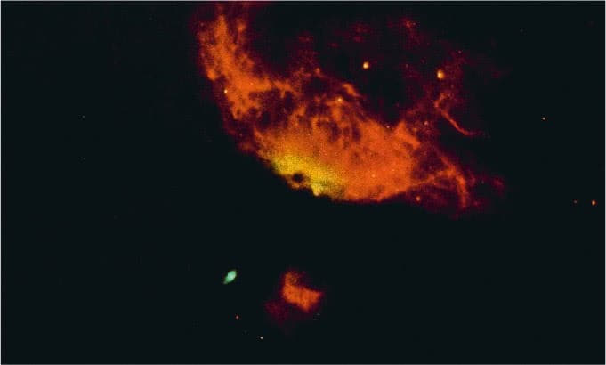 Туманность Ориона вблизи. Под воздействием излучения горячих звезд ее газ светится разными цветами. Часть туманности заслонена поглощающей свет пылью. Туманность Ориона видна с Земли невооруженным глазом.