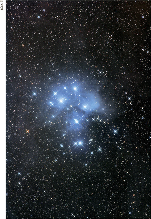Перед нами Плеяды – скопление молодых звезд, родившихся совсем недавно и потому еще не сбросивших пелену межзвездного газа и пыли.