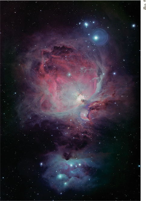 Огромное облако светящегося межзвездного газа и светонепроницаемой пыли, в котором рождаются десятки новых звезд. Туманность удалена от нас на 1500 световых лет, ее размер – около 40 световых лет в поперечнике. Если посмотреть на созвездие Орион зимней ночью, эта звездная колыбель будет видна как расплывчатая центральная «звезда» на его мече.