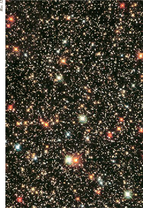 Насколько их много, дает некоторое представление следующее фото. Мы смотрим из плоскости Млечного Пути в направлении скопления галактик в Геркулесе и видим еще большее их число за пределами Млечного Пути. (На самом деле галактик во Вселенной больше, чем звезд в Млечном Пути.) Как и на предыдущих изображениях, на переднем плане звезды, но в основном здесь представлены галактики – развернутые ребром спиральные, эллиптические и другие. За пределами Млечного Пути насчитывается по меньшей мере тысячи миллионов, а возможно, и сотни тысяч миллионов галактик, каждая из которых состоит приблизительно из такого же количества звезд, что и наша. Так что если все это перемножить, число получится внушительное, сейчас посчитаем: десять в степени… Единица с двадцатью тремя нолями – и Солнце лишь одна из этих звезд. Очень полезный подсчет для определения нашего места во Вселенной. И вот, на мой взгляд, это огромное число миров, огромные размеры Вселенной не учитывает, даже формально, ни одна религия, особенно западная.