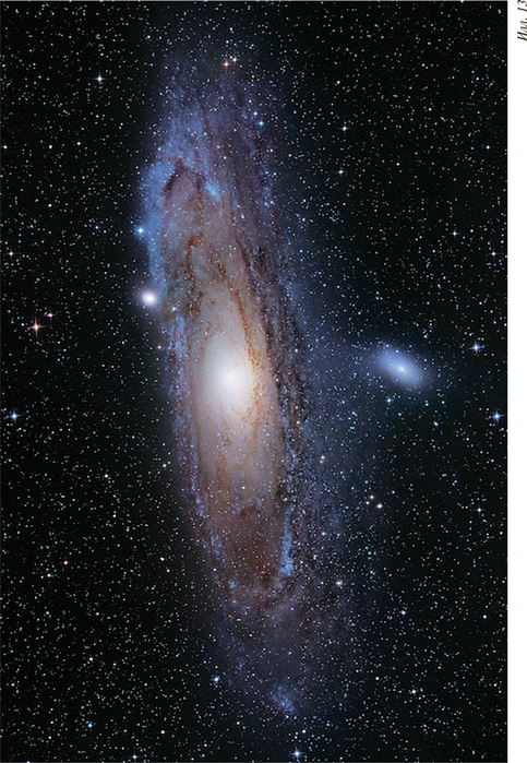 Было бы неплохо получить фотографию Млечного Пути с подходящего расстояния, но фотоаппараты туда еще не отправлены, поэтому нам остается довольствоваться снимком галактики, похожей на нашу, точнее, ближайшей спиральной галактики, похожей на нашу, – M31 в созвездии Андромеда. И снова на переднем плане звезды Млечного Пути, сквозь которые виднеется M31 и две ее галактики-спутника.
