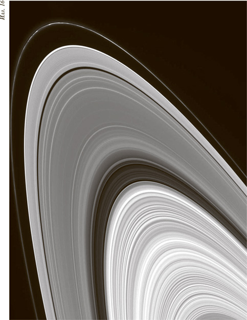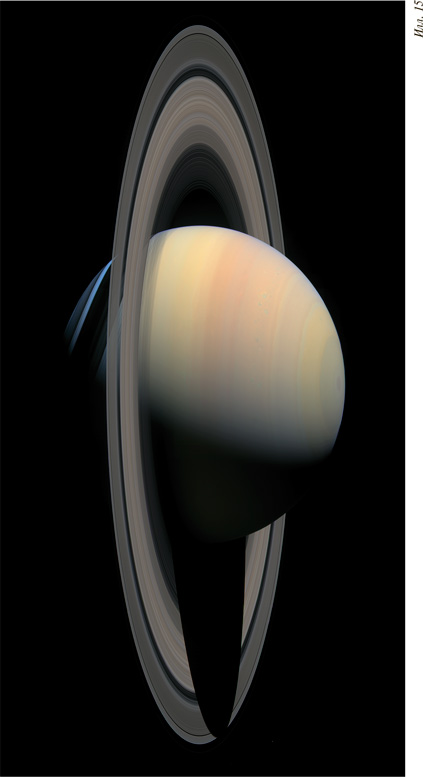 На крупном плане мы видим концентрические кольца. Теперь мы знаем, что таких колец многие сотни, все они лежат в одной плоскости, и еще мы знаем – а Кант и Лаплас лишь догадывались, – что они состоят из глыб и пылевых частиц. Кстати, соотношение между толщиной и шириной колец Сатурна меньше, чем у листа бумаги.