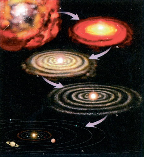 Хаотичное облако межзвездного газа и пыли стягивается под воздействием собственного тяготения (А). Основная масса оказывается в центре и поджигает Солнце, однако остаточное вращение не дает облаку стянуться в точку, в результате образуется плоский вращающийся диск (B). Составляющие диск частицы сгущаются в более крупные тела, и самые крупные из них прокладывают себе дорожки среди остатков (C). В результате столкновений частицы вырастают в размерах и уменьшаются в количестве (D), формируя в конечном итоге Солнечную систему в ее нынешнем виде (Е).