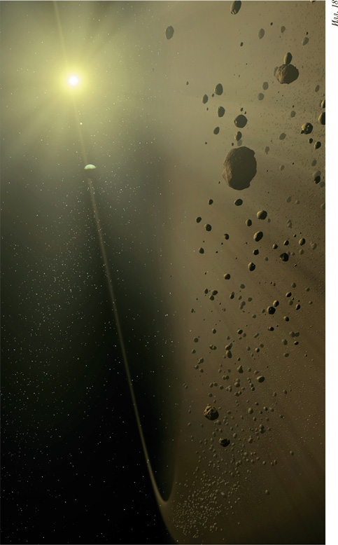 Более того, теперь мы знаем, что беспорядочная ориентация комет не была такой изначально: скорее всего, они тоже зарождались в солнечной туманности, обращались вокруг Солнца в одном направлении, были выброшены из нее в ходе гравитационного взаимодействия с основными планетами, а потом их орбиты расстроились в результате гравитационного возмущения, вызываемого звездами.