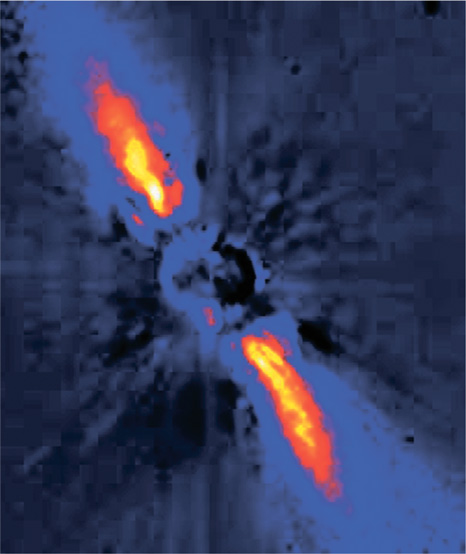 На этом снимке 1997 г. запечатлены в условных цветах края осколочного диска, окружающего звезду Бета Живописца, которая примерно за 20 лет до этого предоставила нам первое свидетельство формирования планет вокруг звезды за пределами нашей Солнечной системы. Телескоп блокирует прямой свет звезды, позволяя различить более слабый свет, отраженный от диска. Разрыв в диске означает, что там идет процесс образования планет. Аналогичные диски вращаются вокруг большинства молодых звезд.