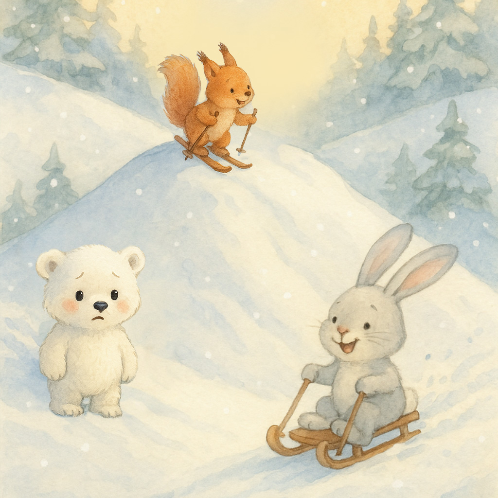 Однажды в лесу выпал особенно пушистый снег, и зверята собрались на большую снежную горку. Бельчата взяли санки, зайчата – лыжи, и даже морской котик Эрик притащил ледянку.