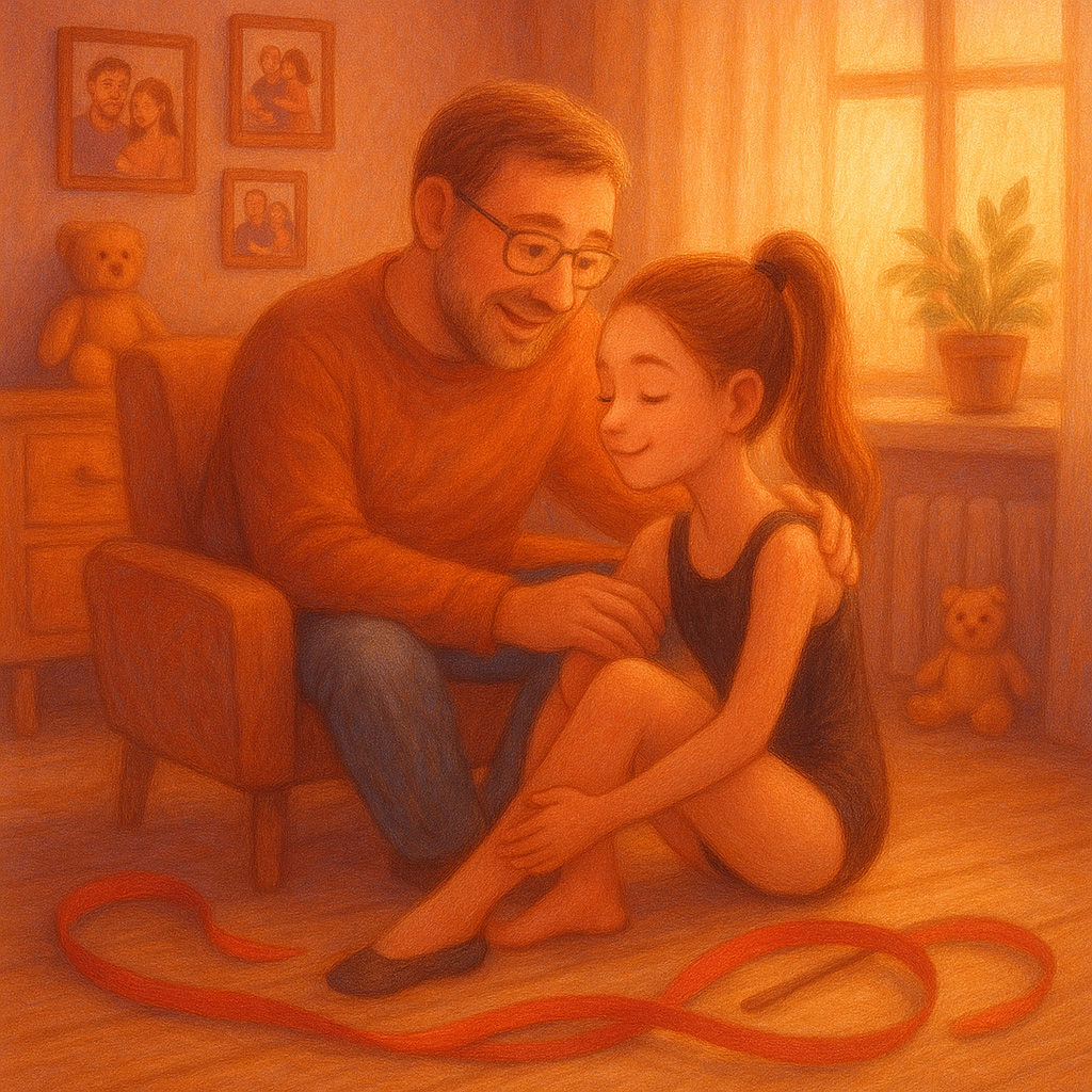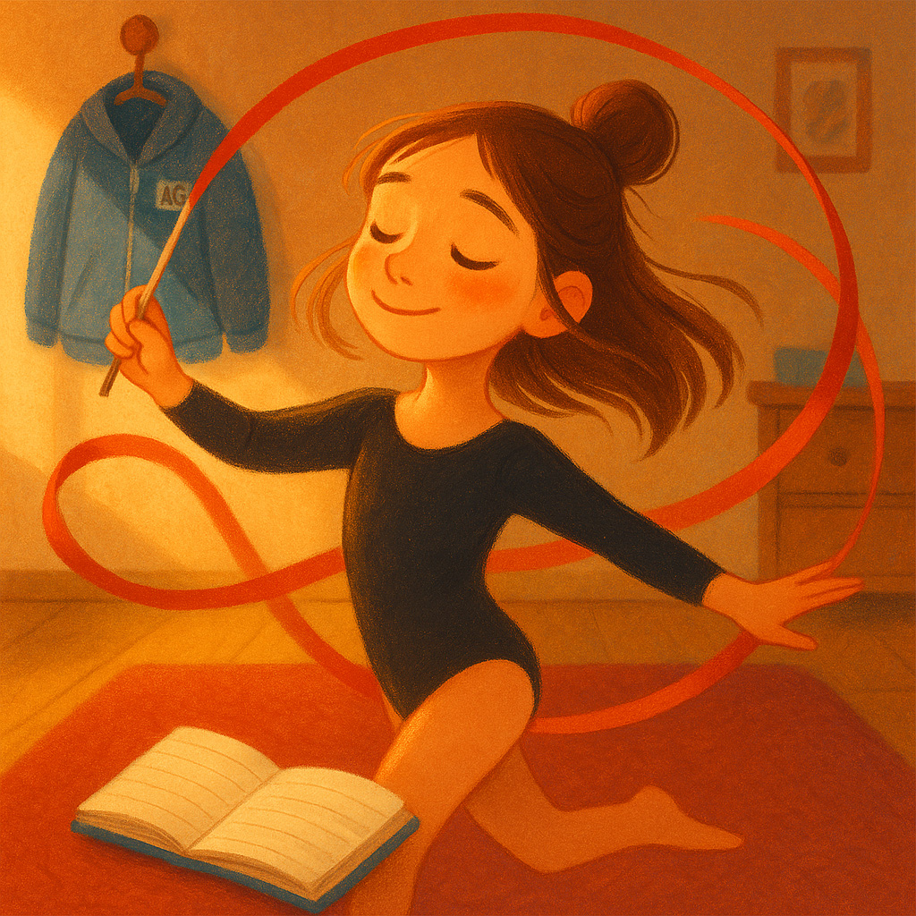 Меня зовут Аня. Мне десять. Я занимаюсь художественной гимнастикой уже почти два года. Иногда мне хочется всё бросить, особенно когда ноги тянутся как варёные макароны, но потом я вспоминаю, зачем пришла.