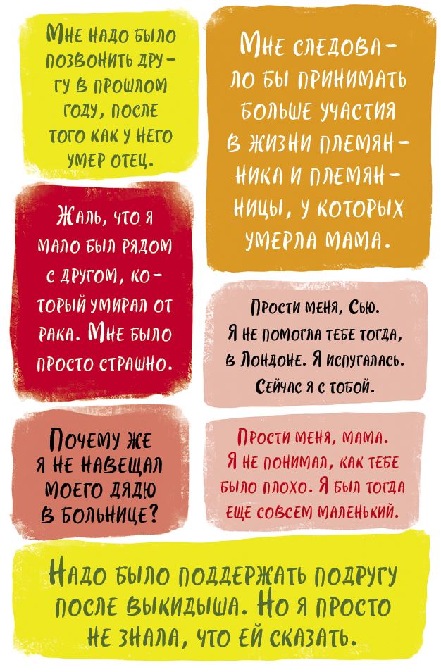Когда вы будете разбираться, почему смутились и не помогли близкому человеку, вот о чем надо помнить: мы всегда о чем-то сожалеем, это нормально. Келси на своих мероприятиях собрала целую коллекцию таких историй – историй о том, как люди постеснялись кого-то пожалеть. Вот например: