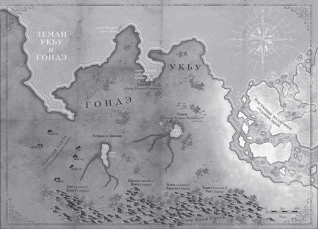 Передача имен собственных и прочих слов из языков льуку и агон представляет собой иную проблему. Поскольку в этом романе мы знакомы с ними лишь через посредство народа дара и его языка, они дважды подверглись преобразованию, что неизбежно привело к определенным потерям и искажениям. Точно так же носители английского языка, пытающиеся транслитерировать при помощи латиницы услышанные ими китайские слова, достигают лишь отдаленного сходства с оригинальными звуками.