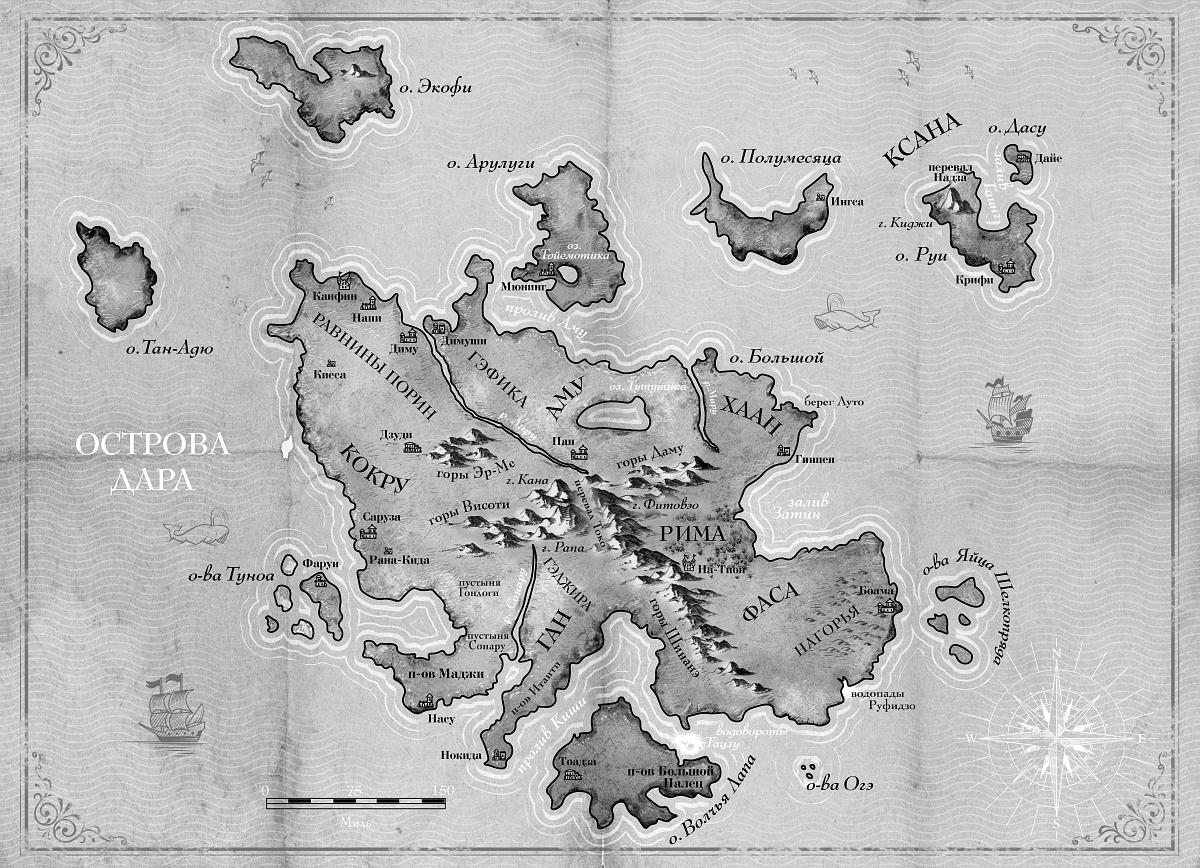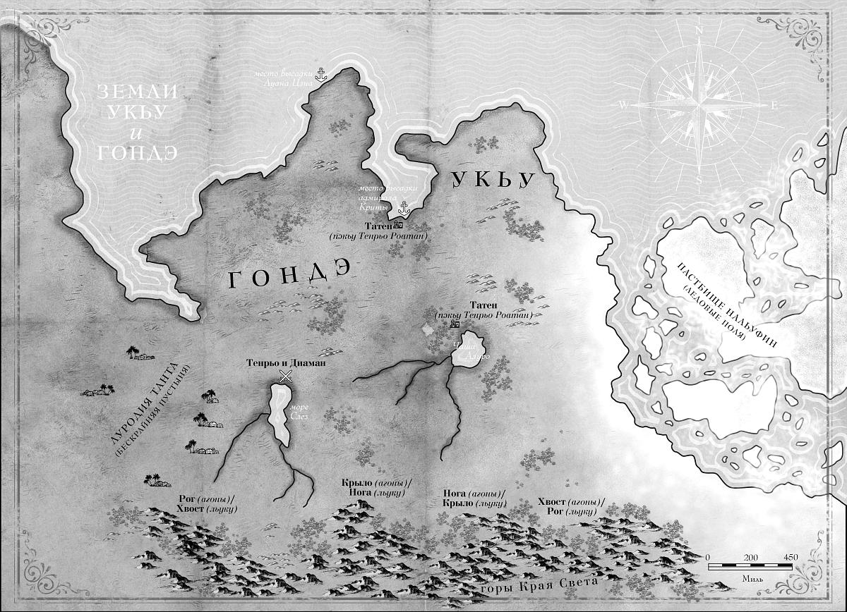 Передача имен собственных и прочих слов из языков льуку и агон является проблемой иного рода. Поскольку в этом романе мы впервые знакомимся с ними через языки народов Дара, они дважды подверглись преобразованию, что неизбежно привело к определенным потерям и искажениям. Точно так же носители английского языка, пытающиеся транслитерировать при помощи латиницы услышанные ими китайские слова, достигают лишь отдаленного сходства с оригинальными звуками.