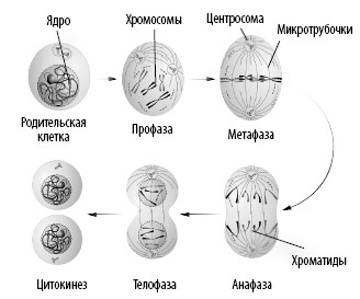В результате митоза образуются две идентичные дочерние клетки, каждая из которых содержит то же диплоидное число хромосом, что и родительская клетка. Клетка делится один раз, но хромосомы исполняют причудливый четырехфазный танец.