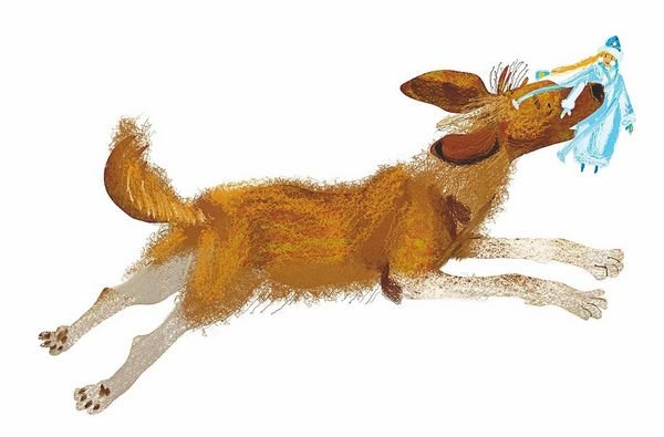 За дверью стоял пёс. Среднего роста, лохматый, одно ухо стоит торчком, а второе висит. Сам пёс был тёмным, рыжим, а живот и лапы белые. «Очень приятное существо», – подумала Алиса.