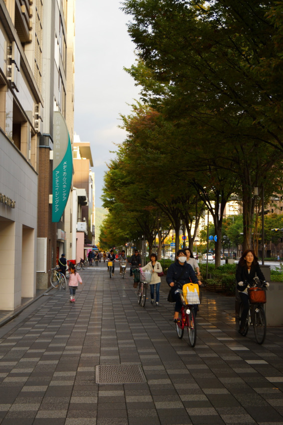 Здания на Оикэ-дори ничем не запоминались. Обычные разноцветные коробки из плит и стекла, разве что почище и поухоженней, чем где-нибудь в Медведково или Алтуфьево. В немалой степени, думаю, тому способствуют густо высаженные по обеим сторонам проспекта деревья. Когда-то деревья росли и вдоль московских улиц, включая такие центральные, как бывшая улица Горького. Поколение, знающее её как Тверскую, даже представить себе не может, каково это – идти посреди Москвы и дышать почти свежим воздухом. Поищите в интернете фотографии конца 70-х – начала 80-х годов, и вы легко поймёте, почему: деревьев было много, а вот машин мало. То же самое сегодня наблюдается и в Японии.