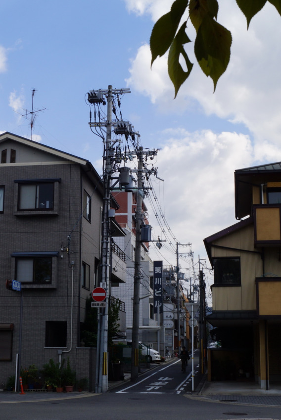 Улочки, с которыми пересекалась Оикэ-дори, выглядели типичными для Киото. Узенькие, с односторонним движением, совершенно прямые и пустынные. Больше всего обращала на себя моё внимание электропроводка: частые столбы были точками притяжения мириад чёрных проводов, которые тянулись и по стенам домов, и поперёк улиц, и от столба к столбу.