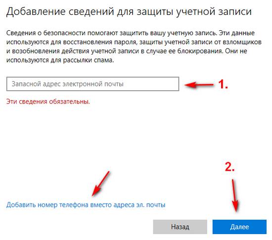 4. Для защиты учётной записи укажите номер телефона и нажмите «Далее». Если вы не хотите использовать телефон, тогда кликните «Добавить адрес эл. почты вместо номера телефона».