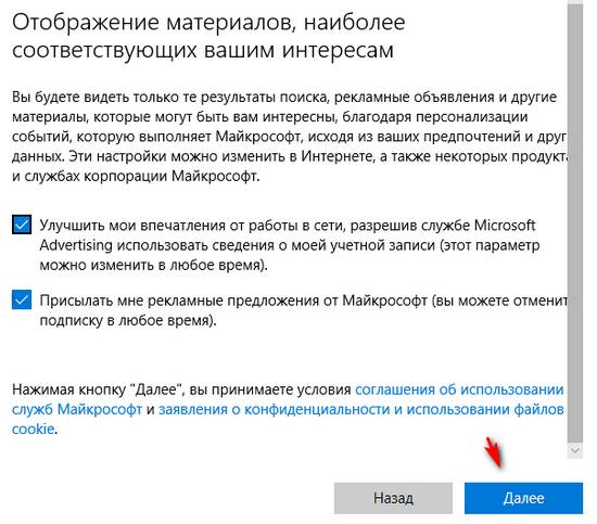 6. В следующем окне поставьте галочки, если хотите получать персональные коммерческие предложения от Майкрософт. В противном случае снимите их. Нажмите «Далее».