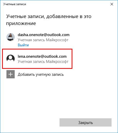 Можно выполнить вход сразу в несколько аккаунтов и работать с ними одновременно. В интерфейсе будет показано название учётной записи, в которую был выполнен вход раньше других. Переключаться между аккаунтами не нужно: OneNote знает, какой учётной записи принадлежит каждая записная книжка.