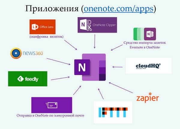 Можно расширить функционал за счёт других приложений, произведённых как Майкрософт, так и сторонними разработчиками. Список рекомендуемых приложений размещён на сайте: onenote.com/apps. Использование самых важных из них описано в главе «Приложения (Apps)».