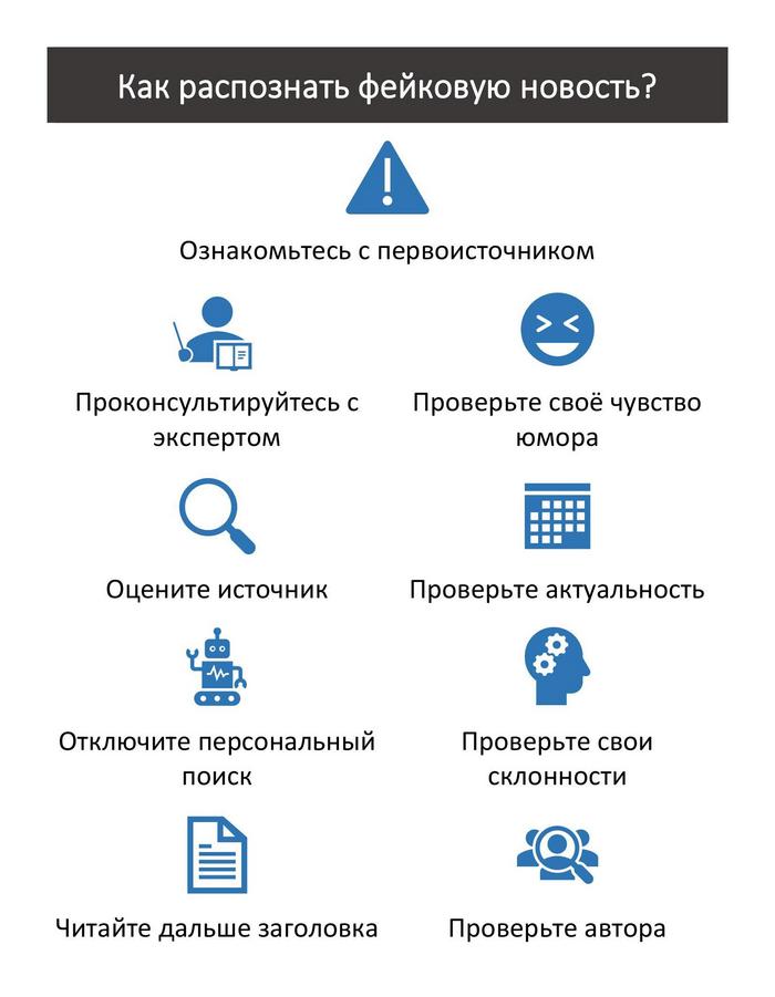 Когда я вижу сообщения вроде «Госдума приняла закон, по которому все обязаны …» или «Президент подписал закон о том, что …» и дальше какая-то пугающая информация и не указан ни один реквизит, я понимаю, что это скорее всего фейк. Авторы правдивых сообщений обычно указывают реквизиты документа, чтобы читатели могли перепроверить эту информацию.2