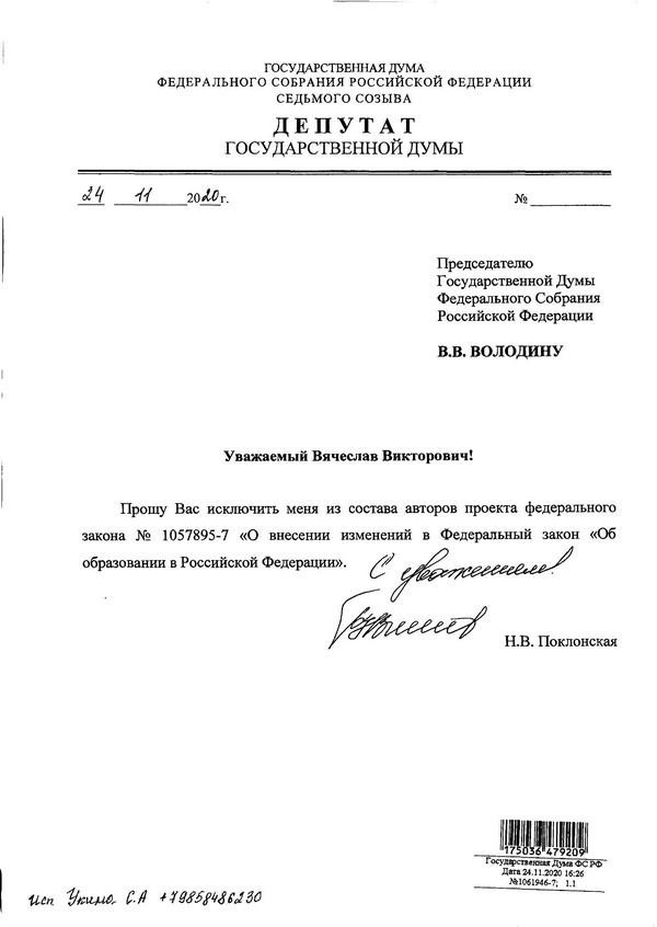 24.11.2020 – снятие инициатором своей фамилии с законопроекта (Депутат ГД Н. В. Поклонская);