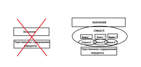Для того, чтобы сознание обнаружило значение перцепта, совершенно не унивариантное к его чувственному слепку – например, при восприятии стула с лежащим на нем котом значение у одних будет «кот», у других «стул», у третьих «стул с котом», причем в зависимости от условий психики как одному и тому же слову могут соответствовать различные чувственные слепки, так и наоборот – между перцептом и значением должна существовать чувственная общность, привносимая к перцепту в процессе восприятия, иначе они никак не могут быть поставлены в соответствие.