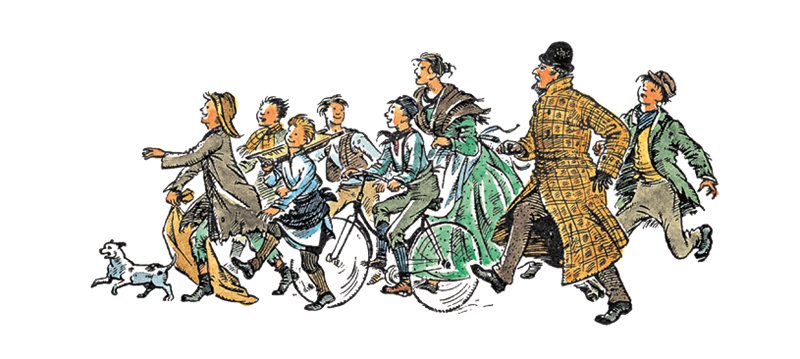 Дигори охнуть не успел, как из-за поворота вылетел ещё один кеб, а из него выскочили толстый джентльмен во фраке и полицейский. Сзади ехал третий кеб с двумя полицейскими и штук двадцать велосипедов; сидевшие на них мальчишки (главным образом разносчики) орали и звонили вовсю. За ними бежала толпа. В домах захлопали окна, на каждом крыльце появилось по слуге или служанке. Кто пропустит такое зрелище!