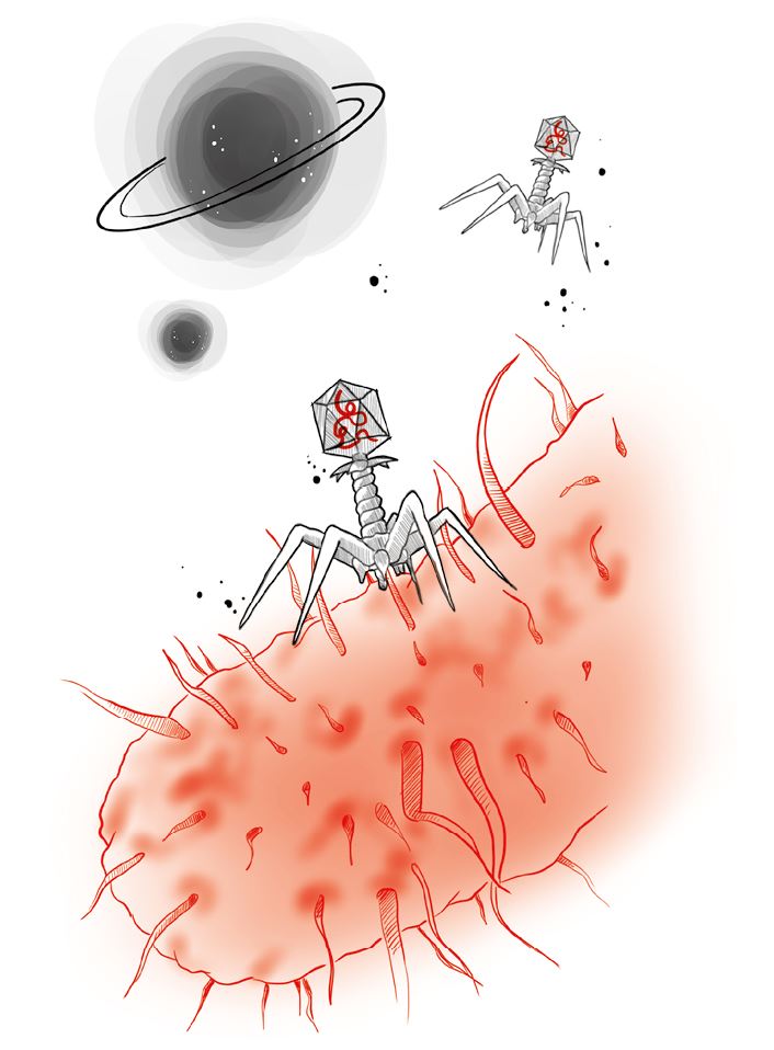 Бактерии могут стать жертвами заражения вирусами. Особые формы вирусов называются бактериофагами, что в переводе означает «пожиратели бактерий». Их головка, так называемый капсид, содержит генетическую информацию вируса и похожа по форме на космическую капсулу. Она закреплена на дискообразной структуре, так называемом воротнике, к которому прикреплен также хвост, способный растягиваться и сокращаться, словно меха гармони. К концу хвоста прикреплен еще один диск – базальная пластинка, заканчивающаяся шиповидным белком. С ее краев свисают отростки, напоминающие ноги паука. При более подробном рассмотрении бактериофага становится очевидным, что вирусы не являются живыми существами.